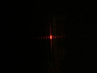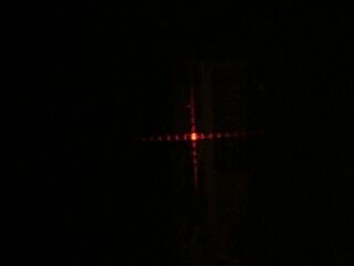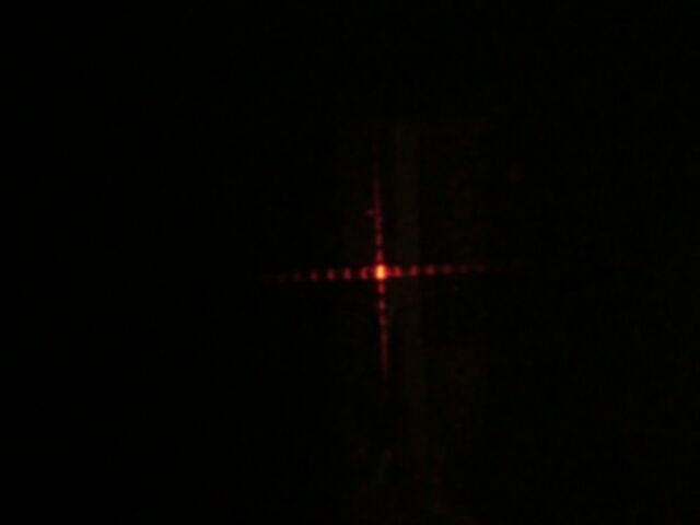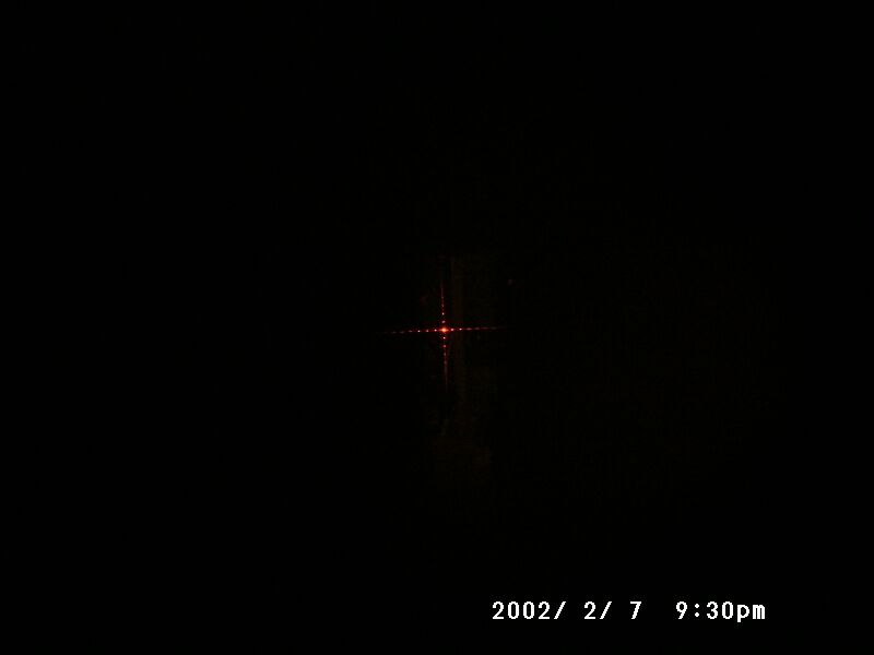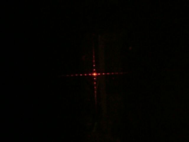 This is the resulting diffraction image out of focus, at maximum optical zoom. (8x) Note the center image and horizontal spikes' height. The center is overexposed. The LCD shows a split image - ll- in the center. |