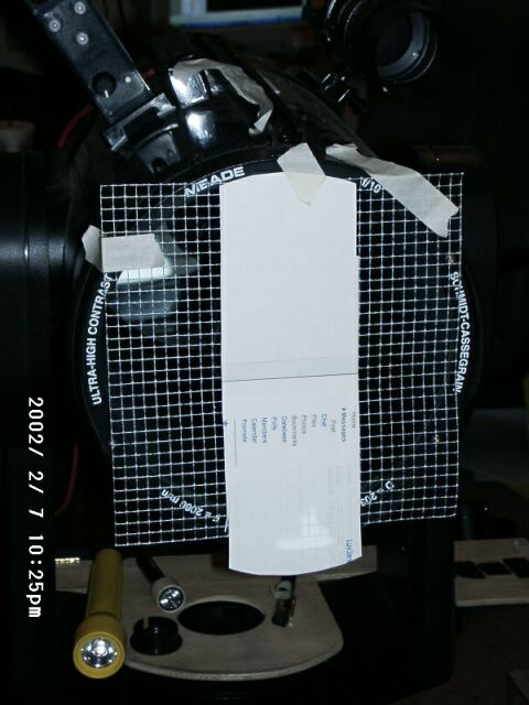 The mesh is standard 1/2 inch hardware cloth in an 8 inch square. (Note to self - make the next square larger!) The center "bar" is just bond paper cut to the center obstruction's diameter. It's all fastened by masking tape, for now. Scope - LX-90, f/10 8" SCT Camera - Casio QV-2900 attached to an Orion 25mm Plossl. Artificial Star - Red LED flashlight on top of scope, reflected in 3" convex mirror 45 feet from the scope. |